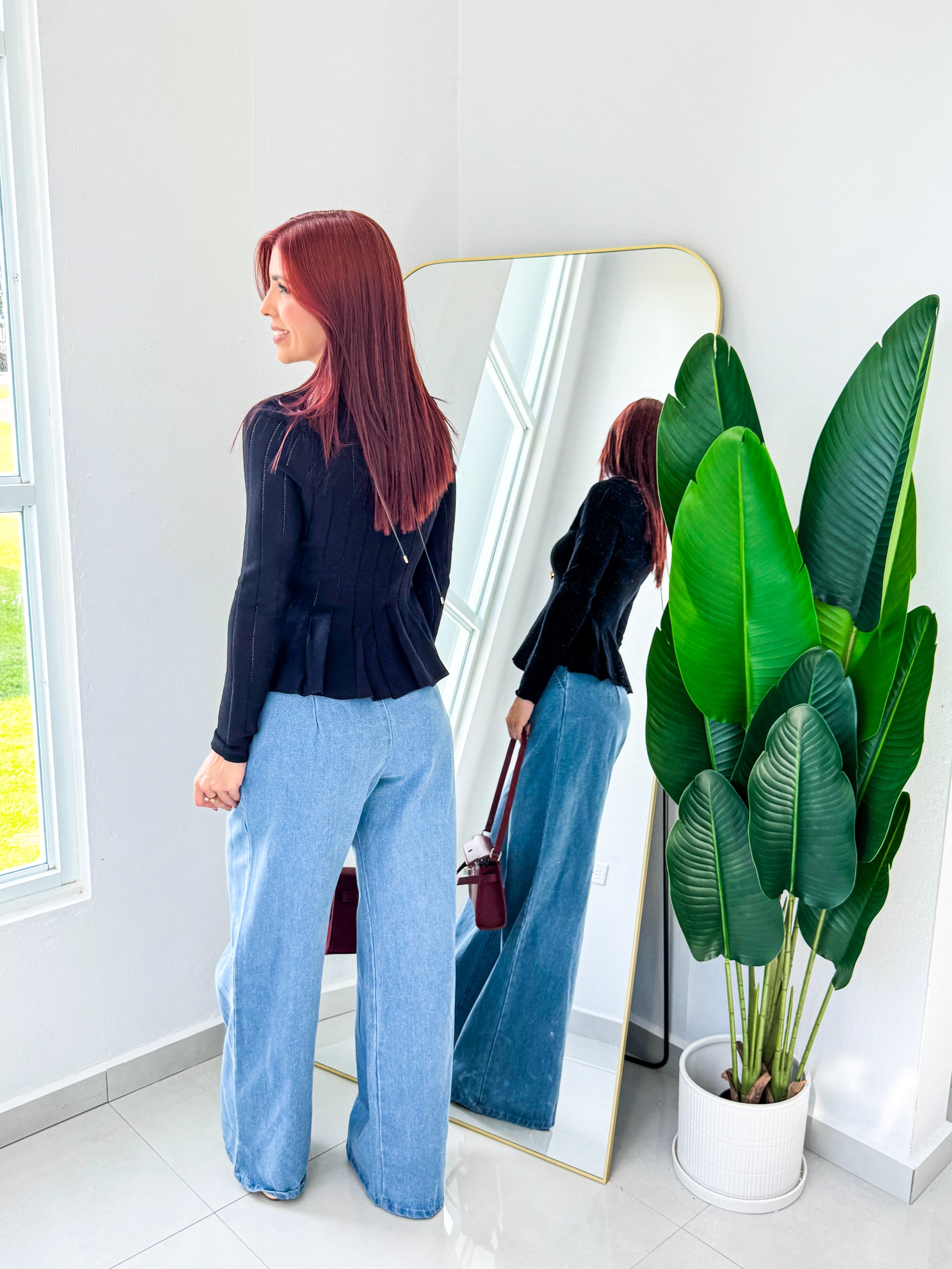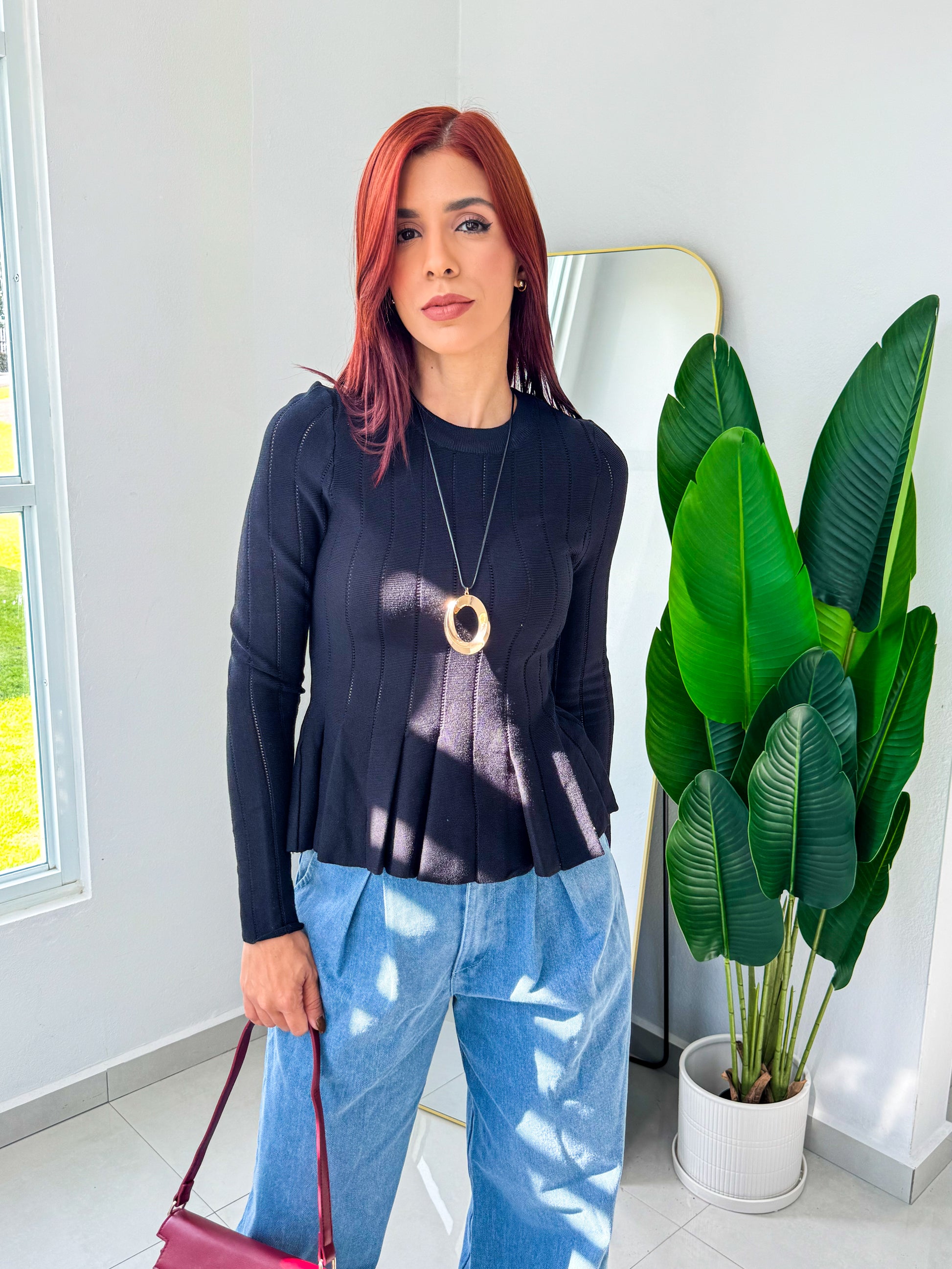 “Astrid” Black Peplum Long Sleeve Top