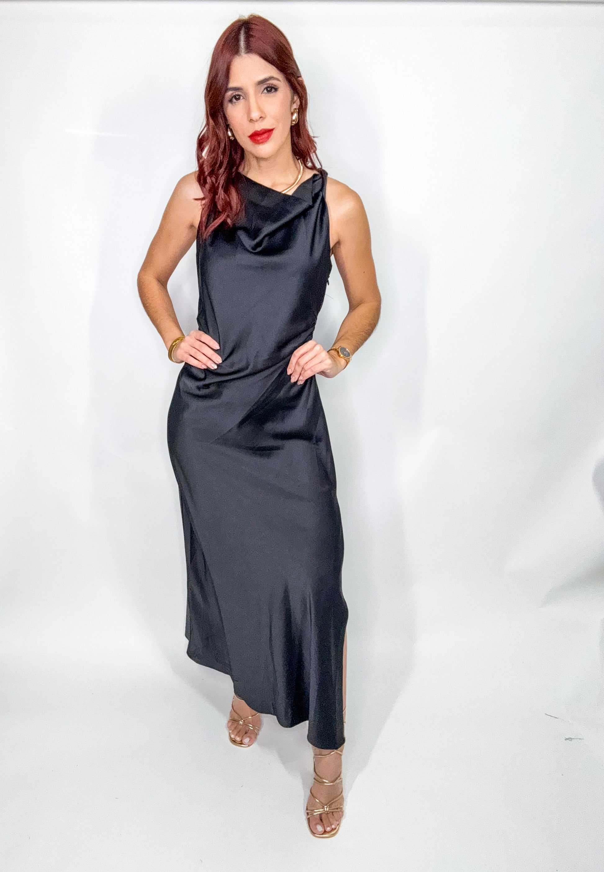 “Carla” Black Satin Maxi Dress