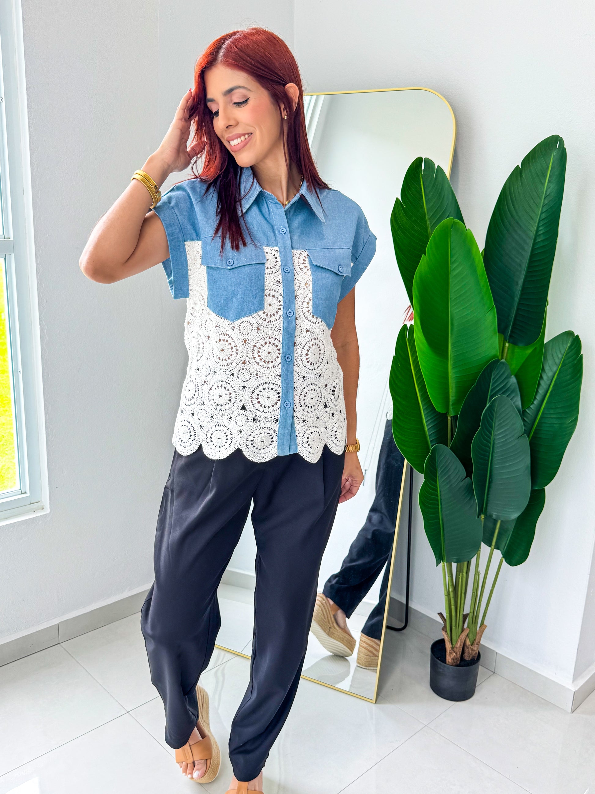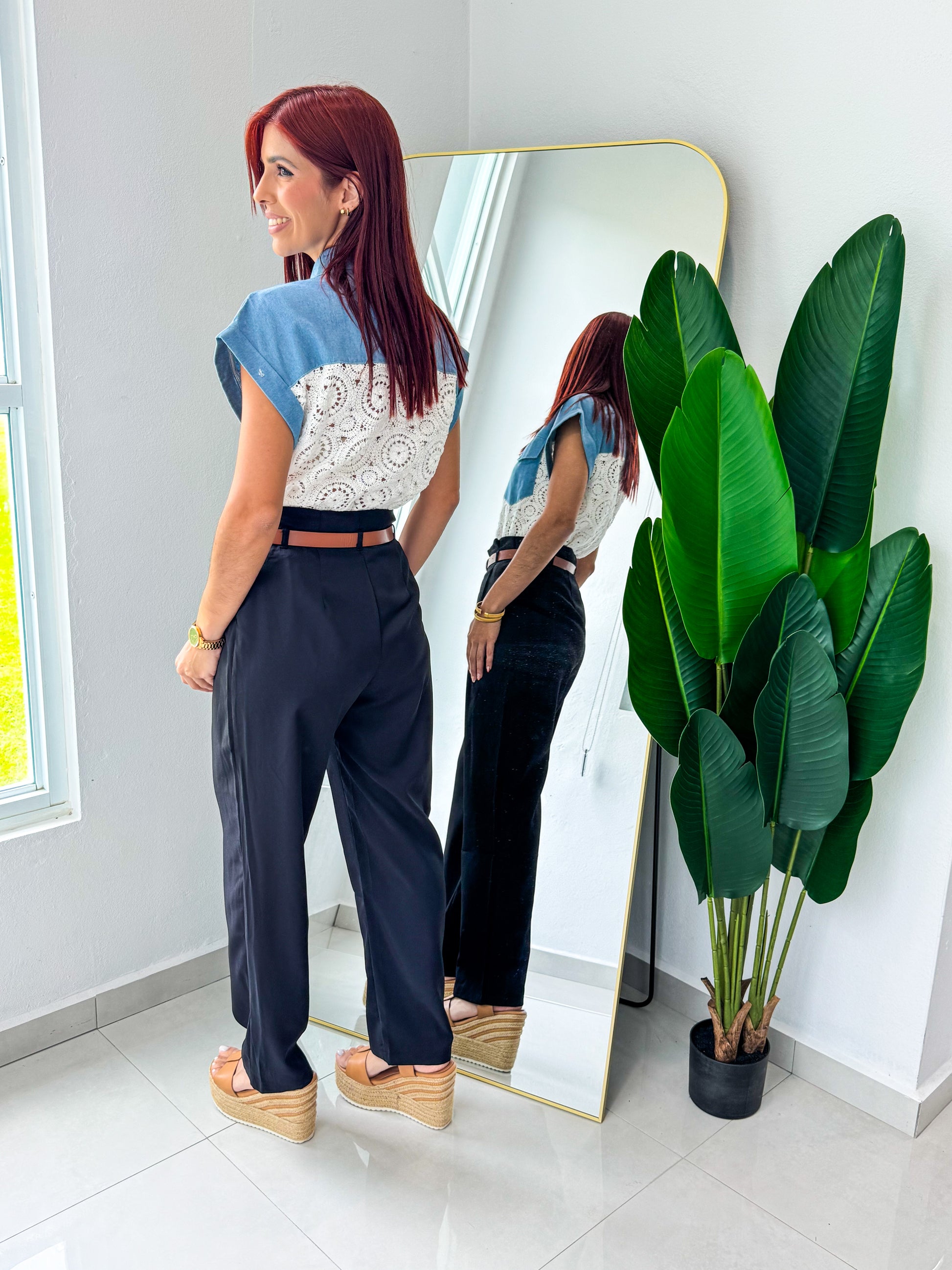 Medidas de la modelo: 34B busto, 28 cintura, 40 caderas y 5’7” estatura.