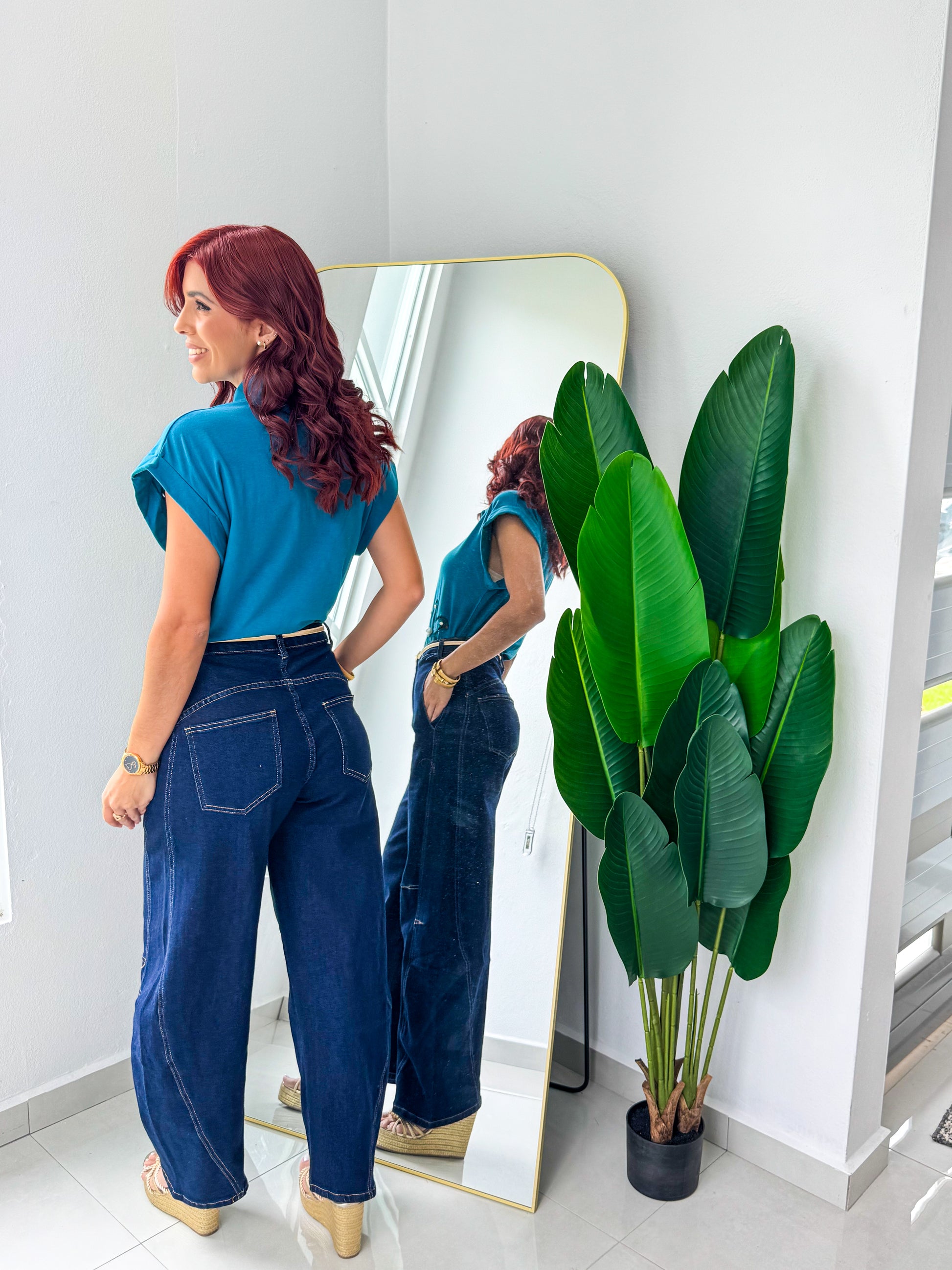 Medidas de la modelo: 34 B busto, 28 cintura, 40 caderas y 5’7” estatura.