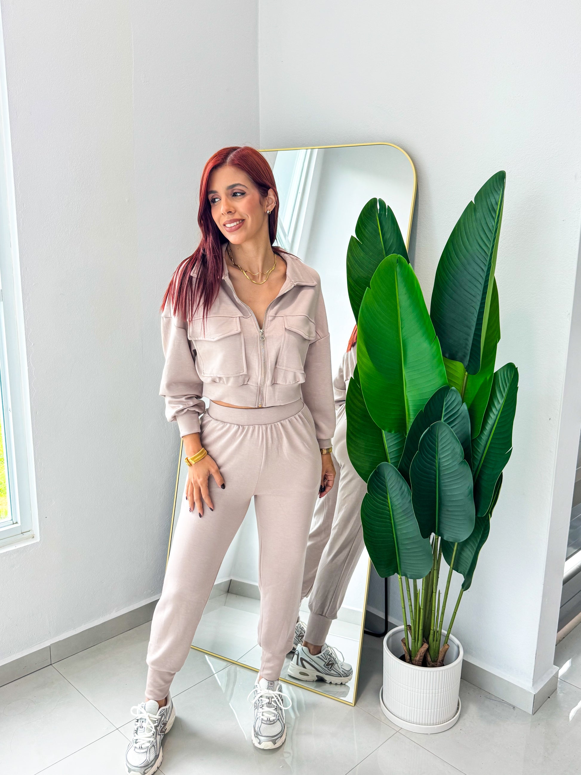 Corre al size. Modelo utiliza talla small. Tiene spandex todo el set. Pantalón tiene elástico en cintura y bolsillos funcionales. Jacket con ziper funcional.
