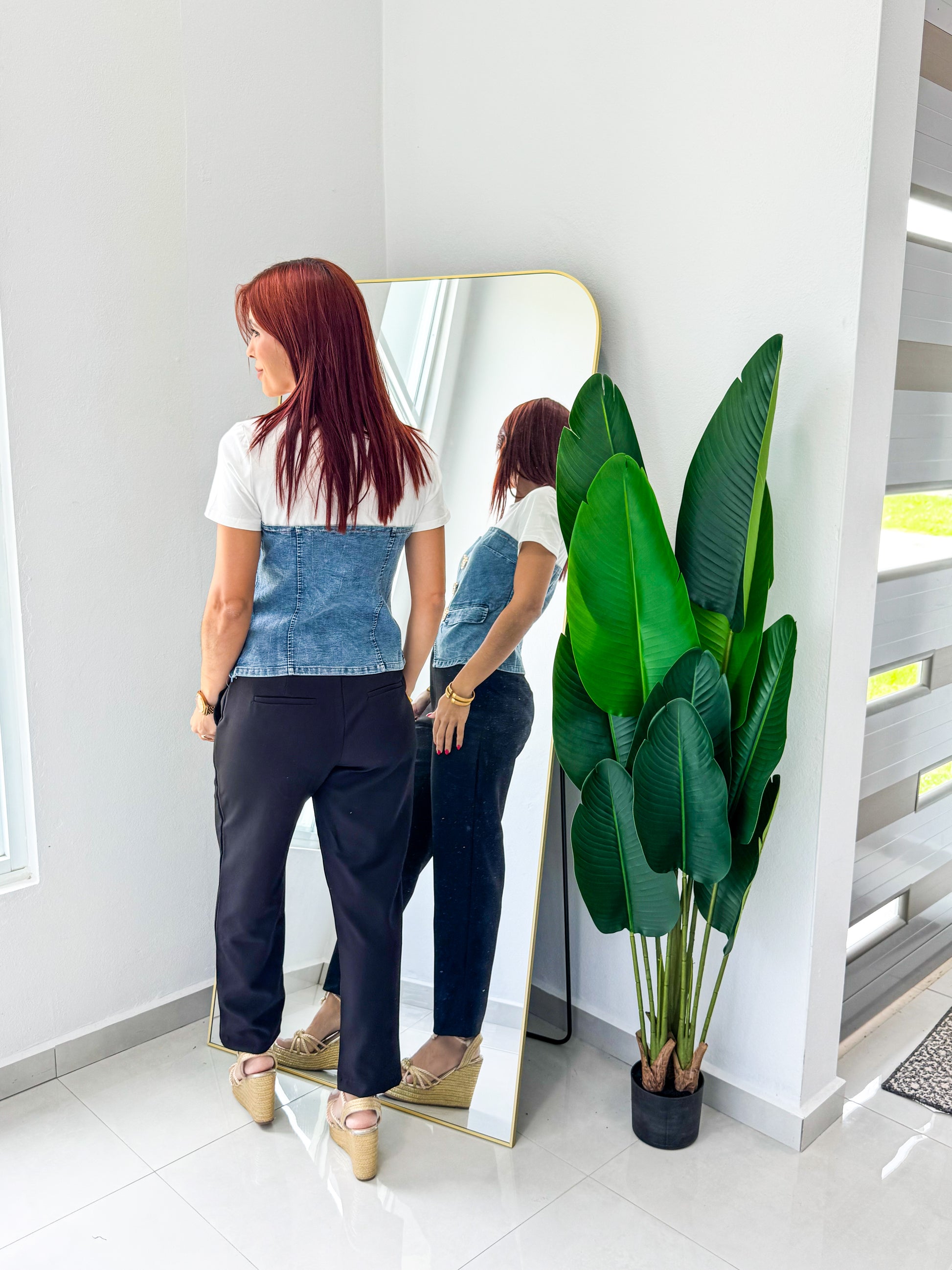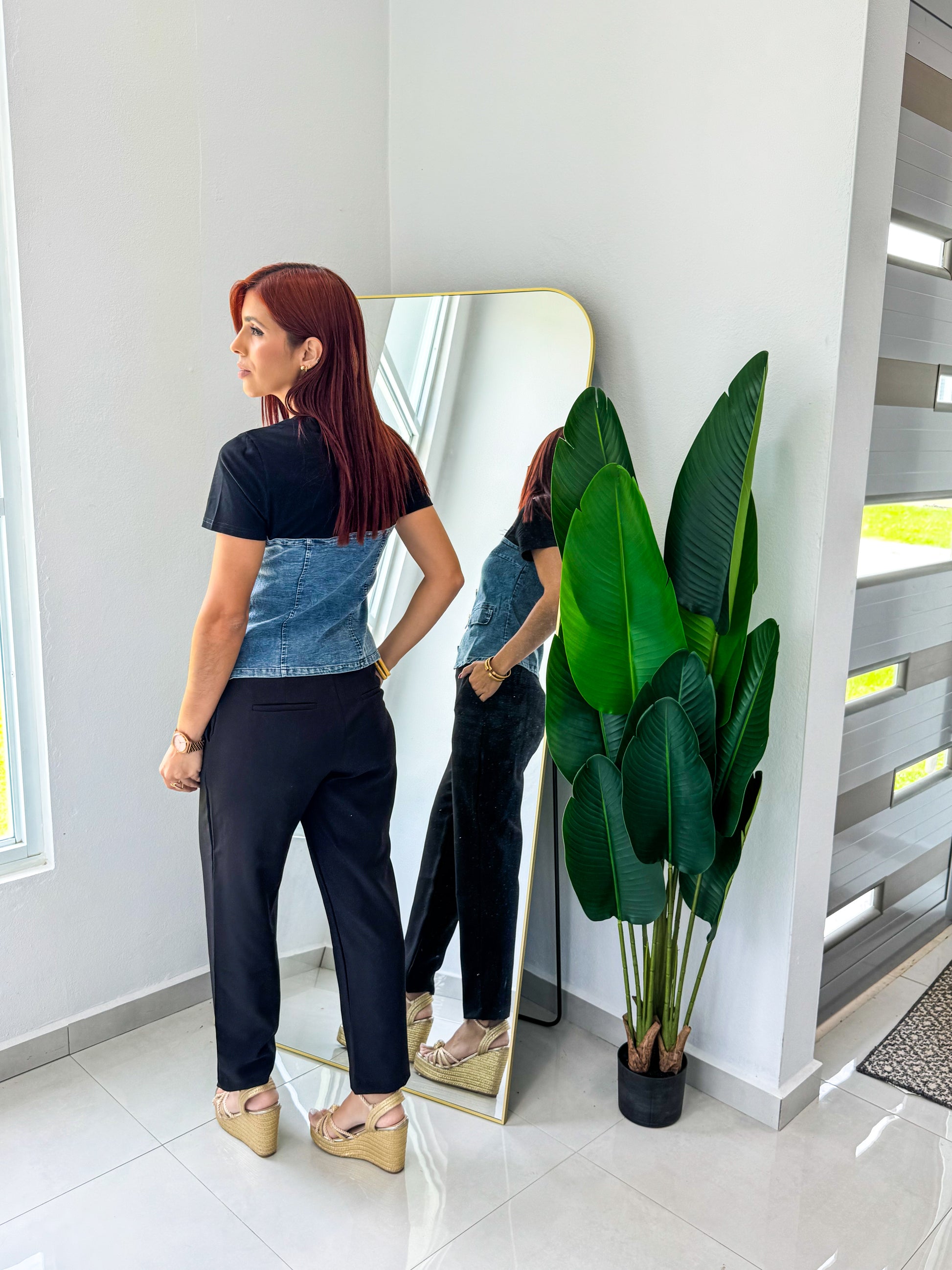 Medidas de la modelo: 34 B busto, 28 cintura, 40 caderas y 5’7” estatura.