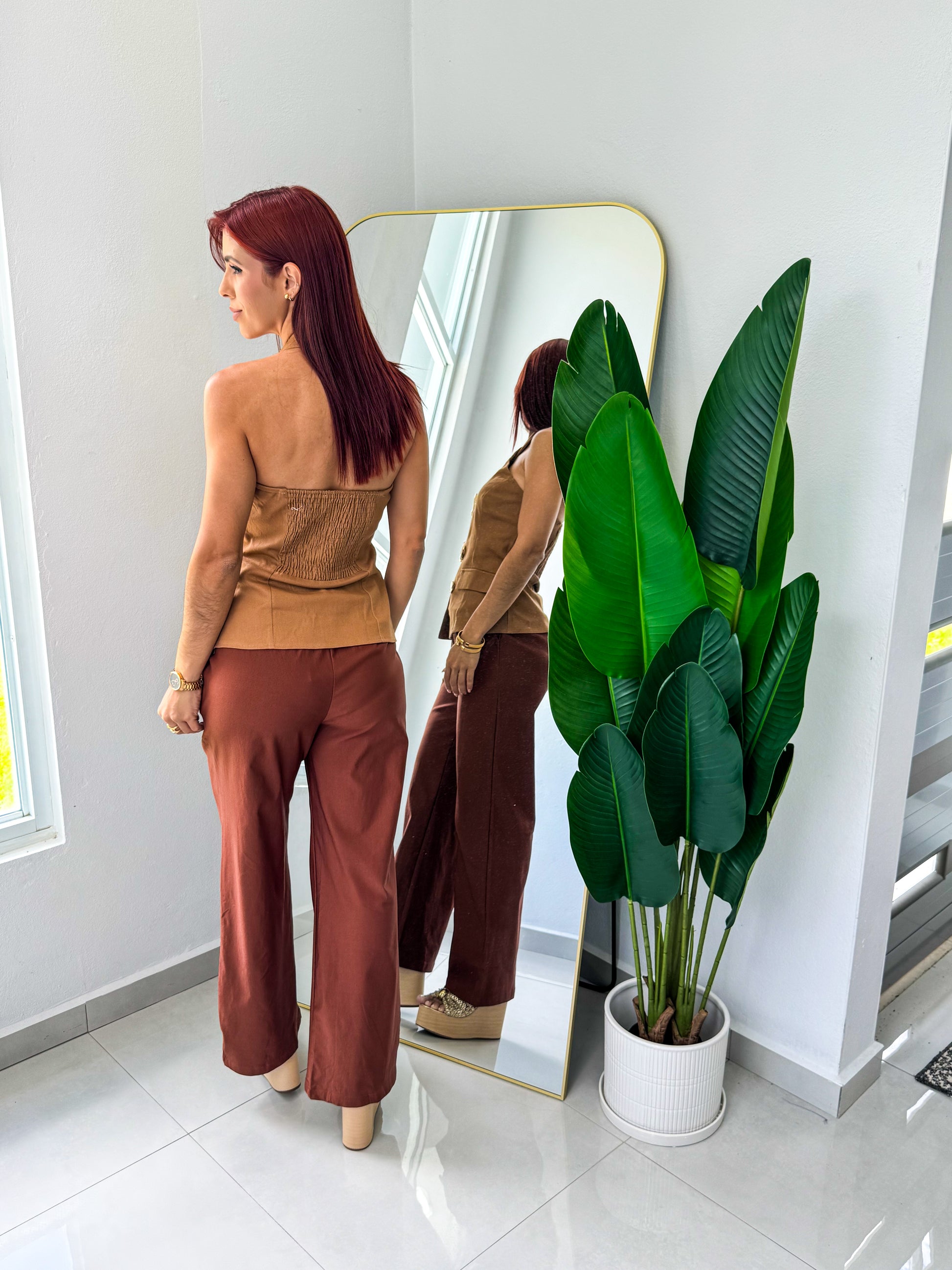Corre al size. Modelo utiliza talla small. Elástico en espalda y cierre con ziper al lado. Cierre con broche en el cuello y detalles dorados removibles.